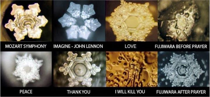 Powszechnie znane są także badania Japończyka Masaru Emoto, który to poddawał wodę działaniu różnych bodźców, potem zaś wykonywał zdjęcia jej kryształów.